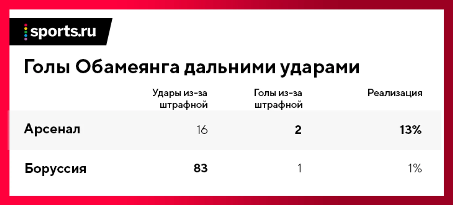 Единственный гол дальним ударом в бундеслиге Обамеянг забил в первый сезон в «Боруссии». Потом надолго забыл о реализации ударов из-за штрафной. В АПЛ он уже забил два таких мяча. Похожая ситуация с мячами после угловых: в Англии уже 2 таких; за последние три с половиной года в Германии – 3.