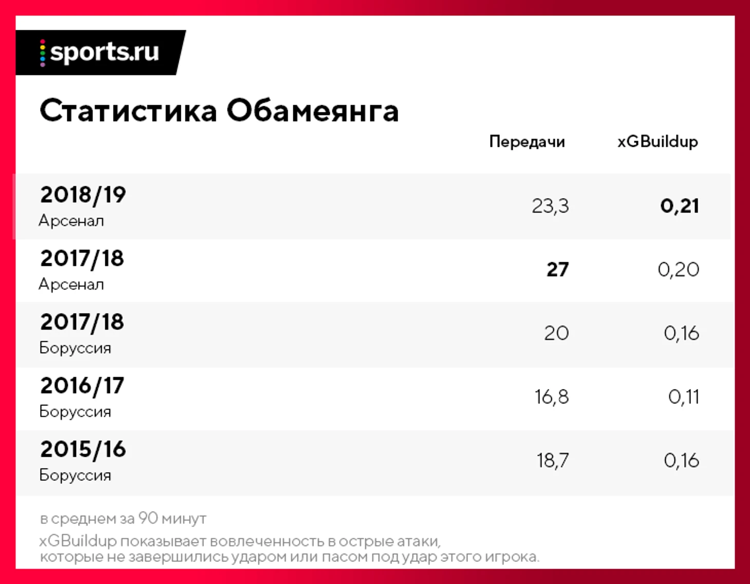 Раньше Обамеянг намного меньше участвовал в игре, пасовал реже и менее точно. Даже в «Боруссии»-2015/16, которая владела мячом 61%, он отдавал чуть меньше 19 передач за игру с точностью 69%. «Арсенал» меньше держит мяч (57,1%), но вовлеченность Обамеянга выросла (23,3 паса с точностью 76%).