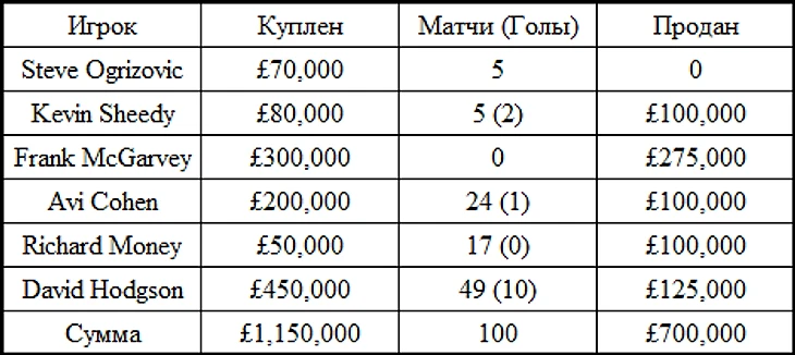 Особняком стоит Стив Огризович, который приходил в качестве дублера для Рэя Клеменса, и в принципе не должен был много играть. Продажа Шиди всего за 100 тысяч фунтов (да еще и «Эвертону») – одна из самых ярких ошибок Пейсли.