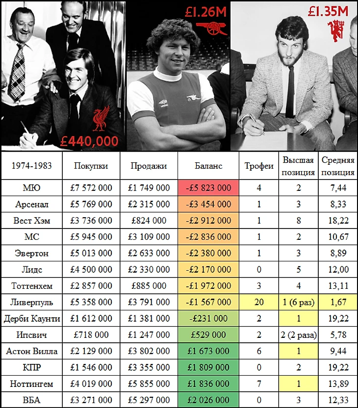 За 9 лет (1974-1983) на посту менеджера Боб Пейсли выиграл 20 трофеев, включая 6 чемпионских титулов и 3 кубка европейских чемпионов. Глядя на современные топ-клубы, трудно поверить, что подобное доминирование возможно без финансового превосходства над конкурентами. Но тот «Ливерпуль» тратил на трансферы значительно меньше, чем клубы из Манчестера и Лондона: