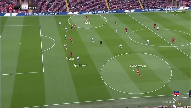 При позиционной обороне «шпоры» тоже слишком многое позволяли крайним защитникам «Ливерпуля». Ситуация перед голом показательна: и Александер-Арнольд, и Робертсон полностью свободны, крайние защитники «Тоттенхэма» слишком глубоко; даже когда необходимость выдвигаться на Робертсона очевидна, Триппьер медлит, так как слишком опасается открывания Мане:
