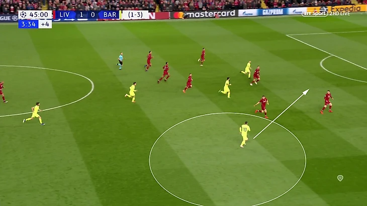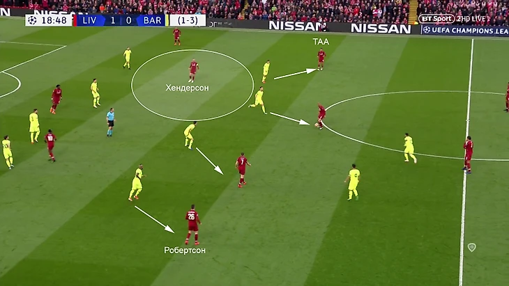 7. Ключом к остроте в данном случае служили именно смелые позиции фланговых защитников «Ливерпуля» и Хендерсона. Разумеется, были и негативные для «Ливерпуля» последствия. Команде часто не хватало футболистов для сдерживания контратак «Барсы» – это повышало нагрузку на Жоэля Матипа и Вирджила ван Дейка.