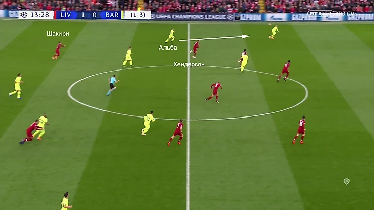 «Барселона» прошла прессинг. Артуро Видаль исполнил умный перевод на фланг Коутиньо-Альбы. Из-за участия в прессинге Шакири слишком высоко, Хендерсон направляется в сторону фланга, но не успеет закрыть набравшего скорость Альбу, плюс оставит центр более свободным: