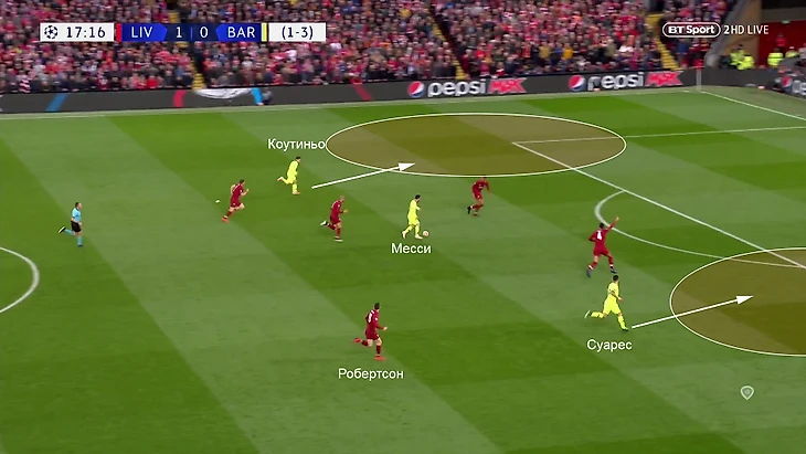 Месси контратакует через центр, ТАА и Хендо вне кадра, Робертсон с опозданием возвращается, у Лео максимум направлений: