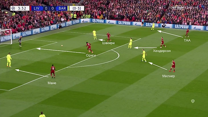 3. «Ливерпуль» предсказуемо начал с ультравысокого прессинга. Ориги прессинговал до вратаря, Мане и Шакири накрывали центральных защитников, Милнер и Хендерсон – полузащитников, а на крайних защитников при необходимости выдвигались Робертсон и Александр-Арнолд.