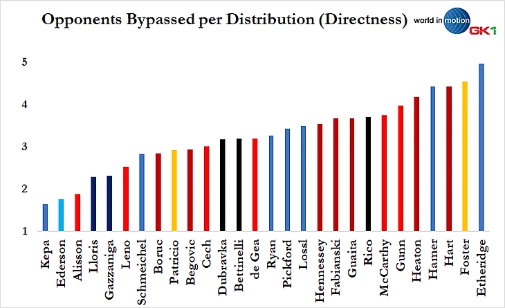 Начнем с графика, который как раз подчеркивает стиль игры и прямолинейность (сколько соперников пройдено пасом из ворот). Тут все логично: вратари «Челси» и «Сити» – в топе, кипер «Кардиффа» – последний.