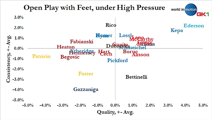 Здесь оценивается трудность передач и уровень игры в пас, когда на кипера оказывается давление. Лучшие – в правом верхнем квадрате. Кепа и Эдерсон – явные лидеры. Хорошо прослеживается разница между Чехом и Лено не в пользу Петра – возможно, именно поэтому Чех присел на лавку, хотя хорош во всех категориях. В углу лучших сразу два вратаря «Саутгемптона» (Алекс Маккарти и Ангус Ганн):