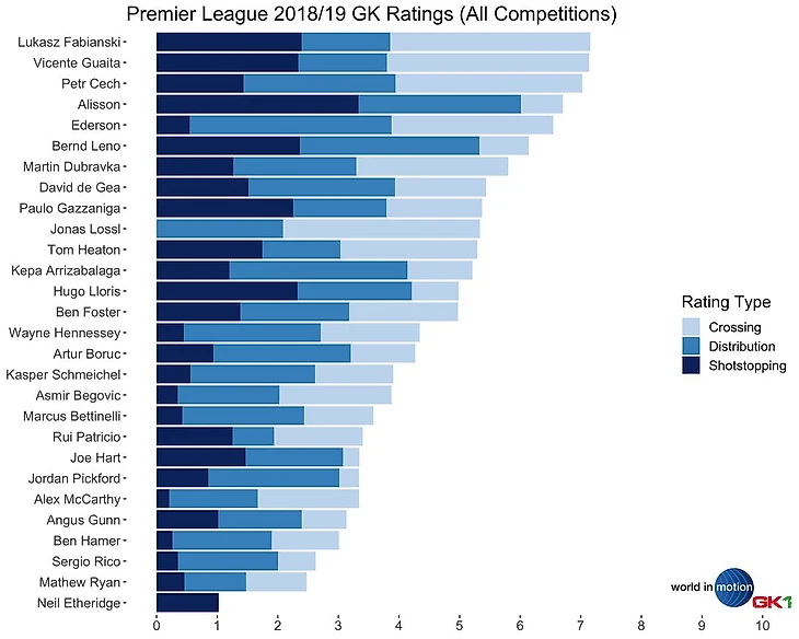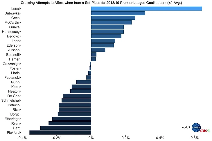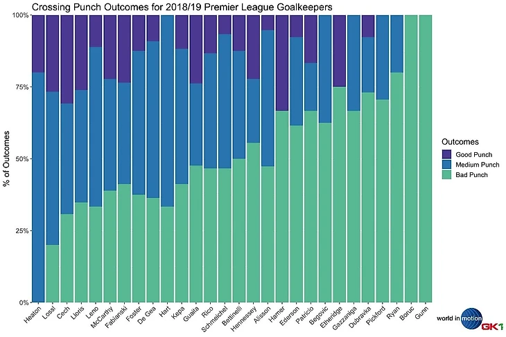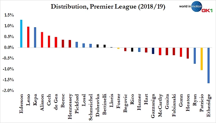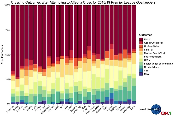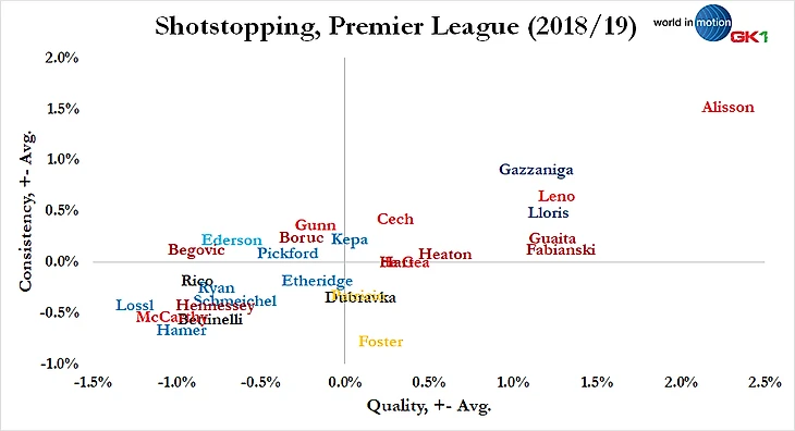 Аналитики компании World in Motion Сэм Джексон и Алекс Уайли провели гигантское исследование вратарской игры в АПЛ. Они просмотрели более 40 тысяч эпизодов (сэйвы, выходы, игра в пас) – по сути каждое действие каждого кипера в матче АПЛ-2018/19.