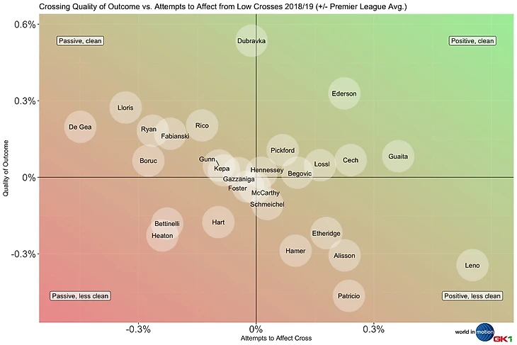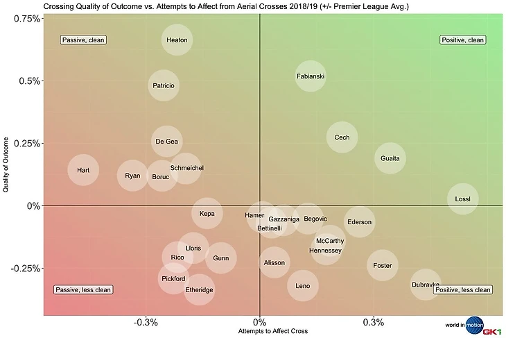Слева вверху – те, кто выходил редко, но успешно. Справа вверху – часто и успешно. Слева внизу – редко и неудачно. Справа внизу – часто, но не очень удачно. У вратаря «Бернли» Хитона лучшее качество игры на выходе. Фабиански к нему близок и бонусом чаще идет на навесы: