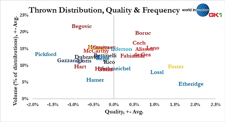 А эта таблица оценивает вбрасывания рукой – как часто вратарь используют прием и насколько качественно. Неожиданный лидер Нил Этеридж из «Кардиффа» (худший вратарь лиги почти во всем остальном), но он недостаточно часто использует прием. Пожалуй, наилучший баланс качества и частоты у вратаря «Уотфорда» Бена Фостера.