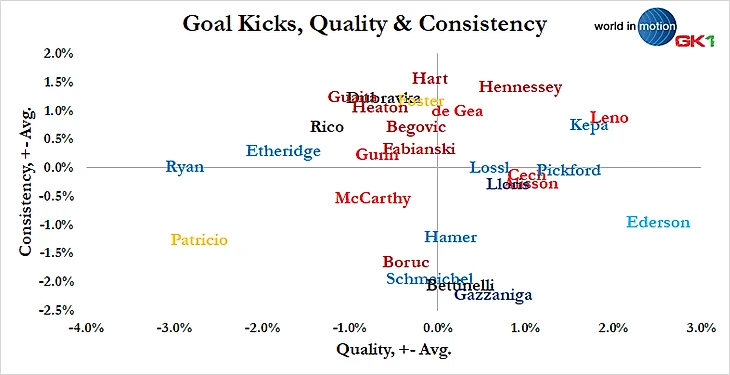 А это качество ударов от ворот. Лено, Кепа и Эдерсон выделяются уровнем исполнения, но Эдерсон, кажется, реже выбирает трудный вариант (вероятно, из-за установок Гвардиолы).