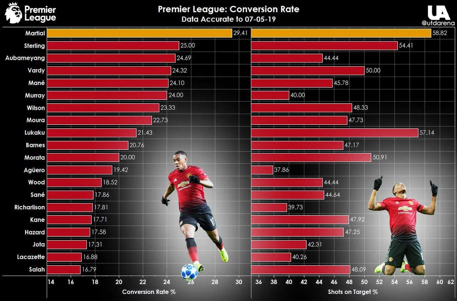 Рэшфорд не раз доказывал, что создан для контратакующей игры. Единственной проблемой был навык реализации выходов 1-на-1 с вратарем, но с приходом Оле Маркус стал лучше в этом компоненте. По словам Джесси Лингарда, главный тренер (если кто не помнит, сам в прошлом шикарный нападающий) персонально работал с Рэшфордом над завершением атак. Марсьяль довольно пассивен без мяча – для системы с высоким прессингом работоспособность форварда крайне важна – но обладает прекрасной техникой и голевым чутьем. Кроме того, Тони – один из лучших в лиге по конверсии ударов в голы.