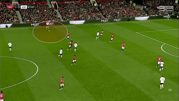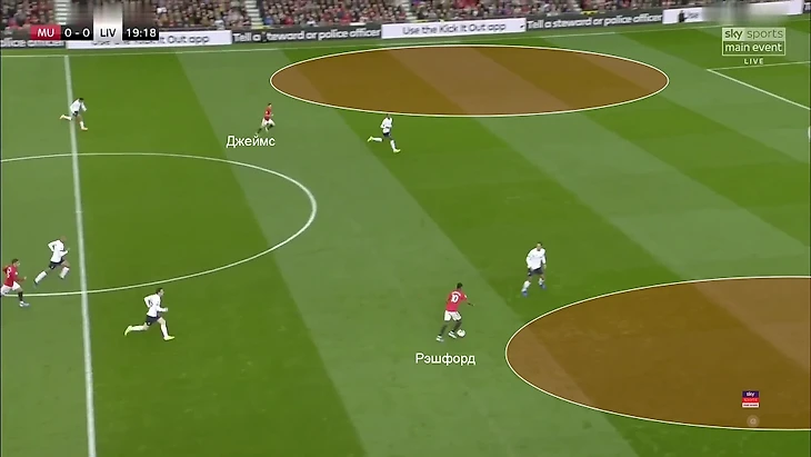 Скорость Рэшфорда и Джеймса в таких ситуациях несет огромную угрозу. Это привело к тому, что и ТАА, и Роббо меньше обычного ходили вперед. А, когда ходили и теряли мяч, возникали такие ситуации: