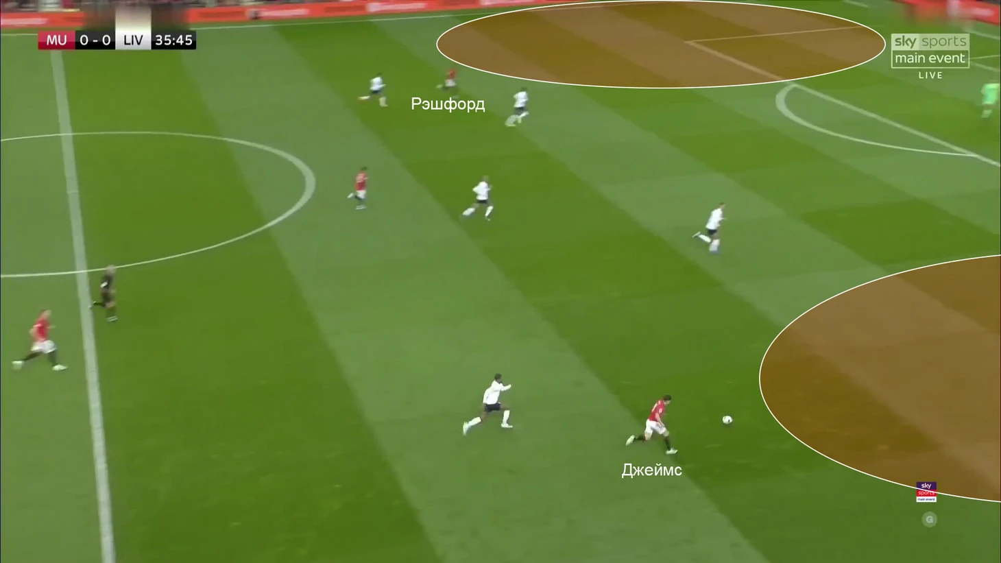 Главное отличие в характере атаки – быстрая, а не позиционная. У «Ливерпуля» нет дополнительных игроков в штрафной. Матип не терялся и старался следить за Рэшфордом, но при правильном резком движении нападающего и качественном навесе шансов у защитника немного – и то, и другое Рэшфорд с Джеймсом организовали.