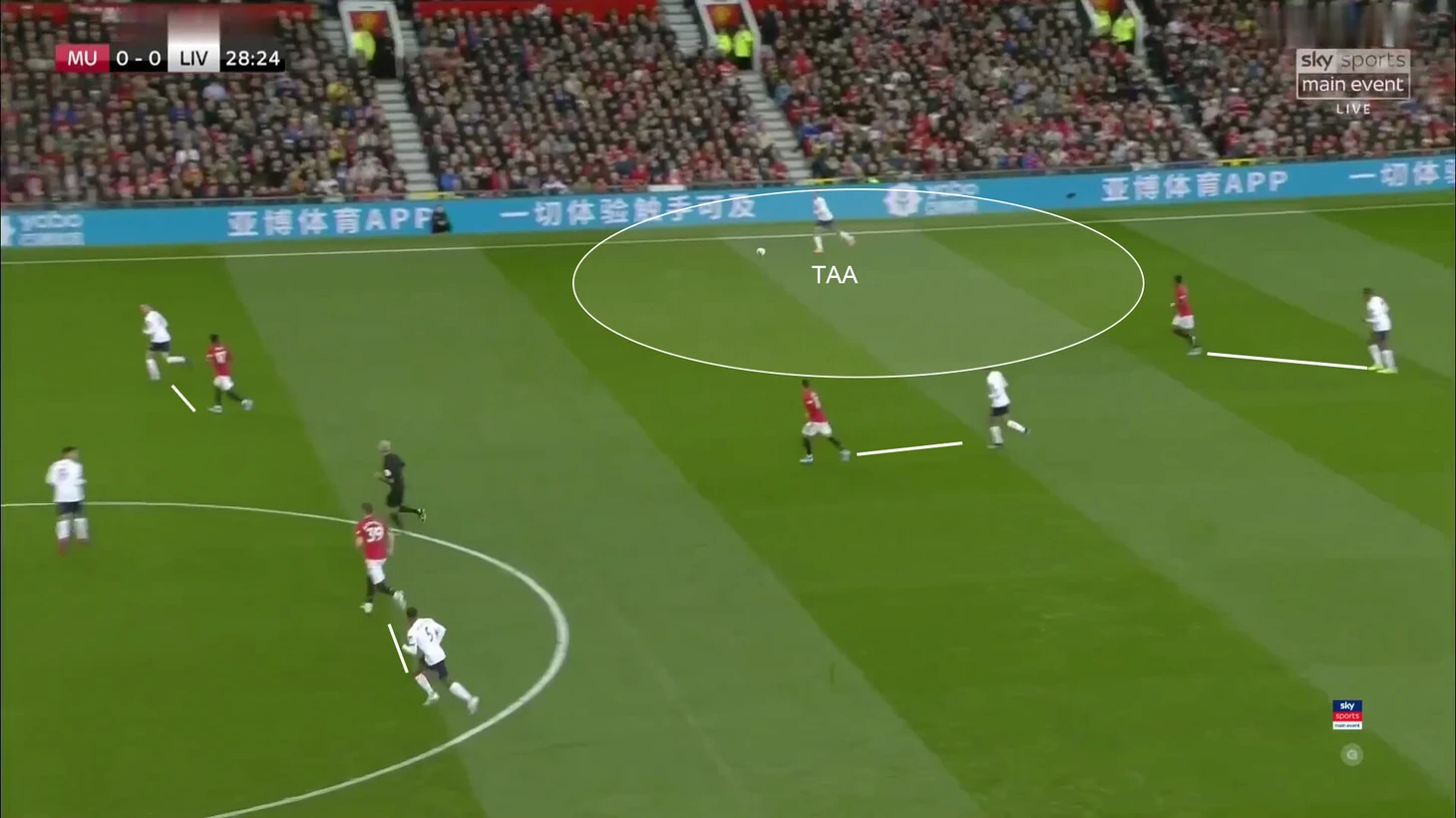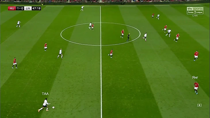 «МЮ» было бы намного труднее реализовать свой план, если бы такая ситуация возникала на двух флангах (она вероятно возникла бы, если бы вместо Ориги был Салах). Но относительная свобода ТАА из глубины была не так страшна, пока все направления атаки перекрыты.