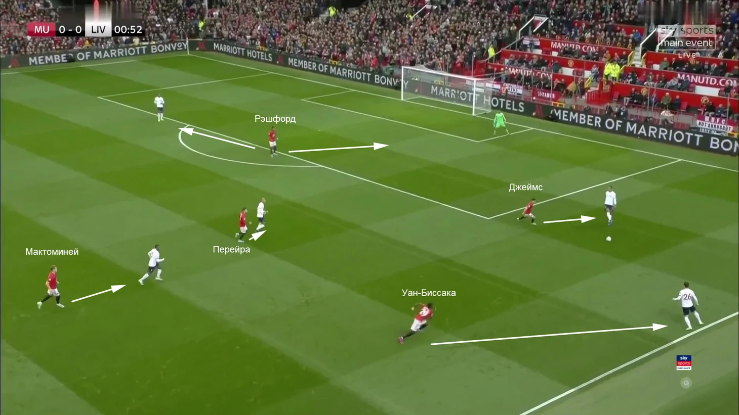 Во-первых, фланги «Юнайтед» работали по-разному. Справа Уан-Биссака смело выдвигался на Робертсона при прессинге, потому что не боялся оставлять Ориги 1-в-1 против Линделефа. Слева Янг не выдвигался до конца, так как не хотел оставлять Рохо 1-в-1 с Мане.