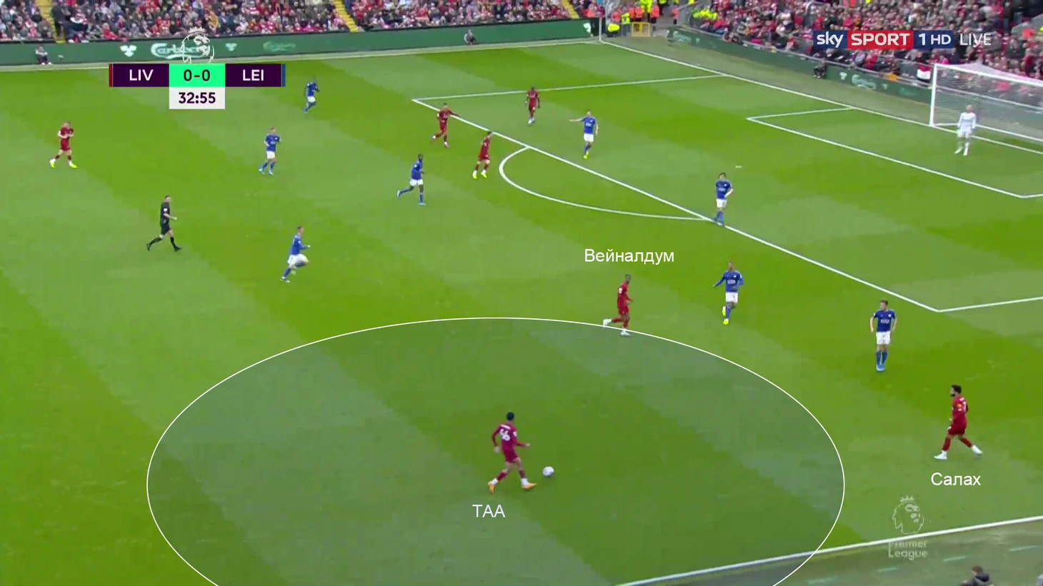 • ТАА предпочитает подавать свободным из глубины, поэтому Хендерсон (Вейналдум) и Салах движением уводят соперников подальше от Трента: