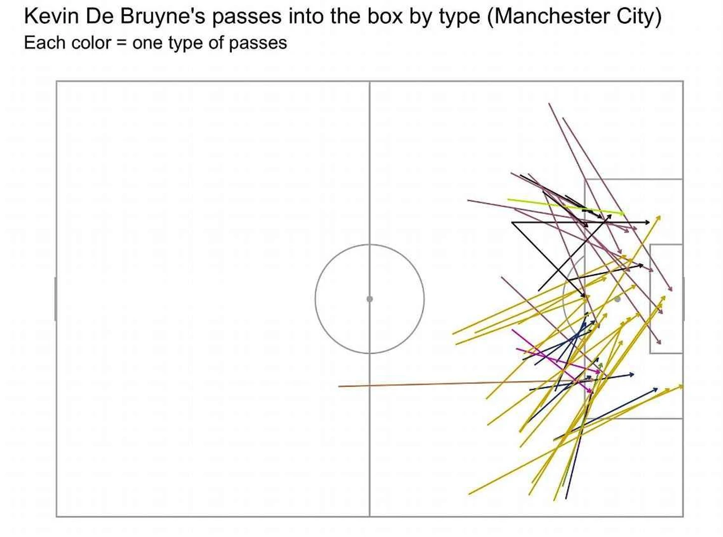 • «Сити» тоже создает ему удобные условия для кроссов. Первый тип – это вариант ТАА. Кевин идет примерно в ту же точку, что ТАА, а партнеры уводят соперников.