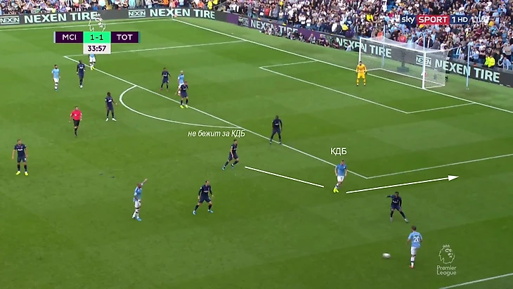 • второй вариант – резкий рывок КДБ в сторону фланга в момент когда правый вингер (Марез или Бернарду) владеет мячом. Если опекун бежит за бельгийцем, Марез получает свободу для прохода через опорную. Большинство соперников боятся оставлять опорную – и оставляют свободным КДБ на фланге. Зря – это еще страшнее.