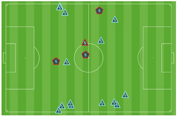 13. Жоржиньо был тактическим оружием, которое организовало переворот в матче. Но и в индивидуальном плане выдал один из лучших перфомансов матча. Он всегда гарантирует контроль, но вчера справился и с огромной нагрузкой по части защиты. Вот карта его оборонительных действий – Жоржиньо не просто закрыл центр, но и играл важную роль в прессинг-ловушках на флангах: