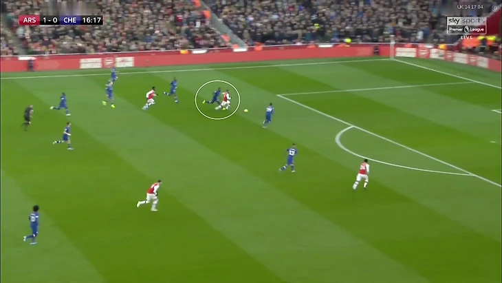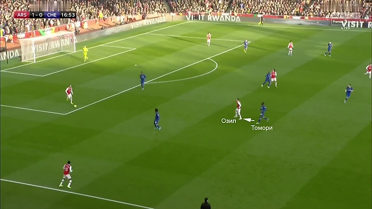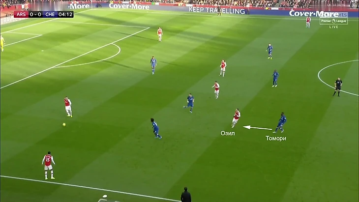 Это очень опасная ситуация: чтобы ее не допускать, «Челси» приходилось явным образом разрушать оборонительную схему. Томори играл персонально с Озилом в таких эпизодах и шел за ним до конца:
