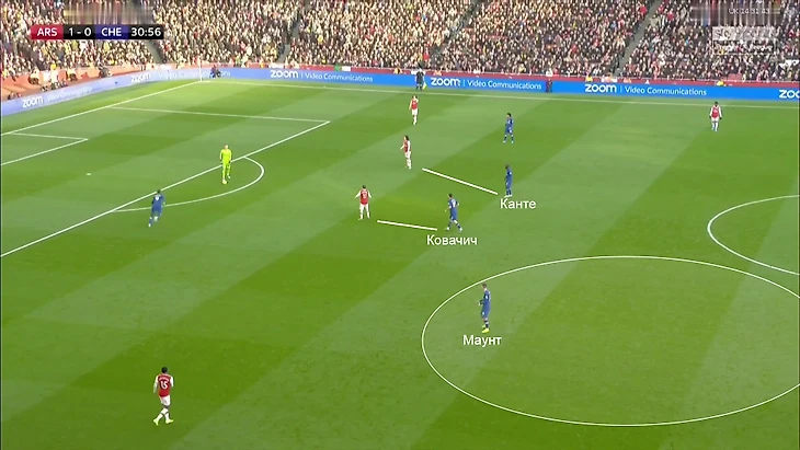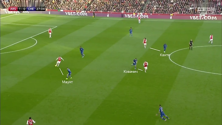 Прессинг не был радикально высоким, но был умным и подготовленным. На первой стадии «Арсенал» перекрывал развитие атаки через центральных полузащитников: Месут Озил закрывал Матео Ковачича, а Александр Ляказетт – Нголо Канте: