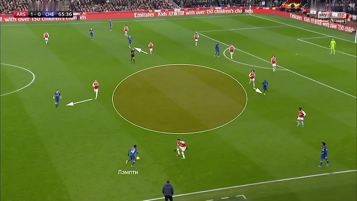 Лэмпти не просто дал нужные качества, а оказался действительно хорош. Он угрожал не только с фланга. Например, в этом эпизоде «Арсенал» по традиции персонально перекрывал центр поля (большую часть матча это работало), из-за персоналок появилась большая зона в опорной – Лэмпти протащил через нее мяч и создал момент:
