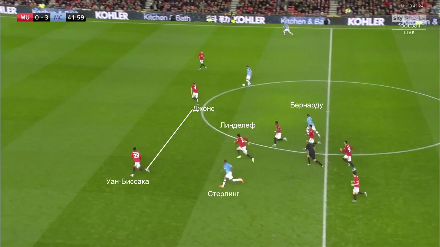 Линделефа выманили из линии защиты, Стерлингу открывается простор для рывка, Уан-Биссаке нужно реагировать на выдвижение Линделефа и рывок Стерлинга.