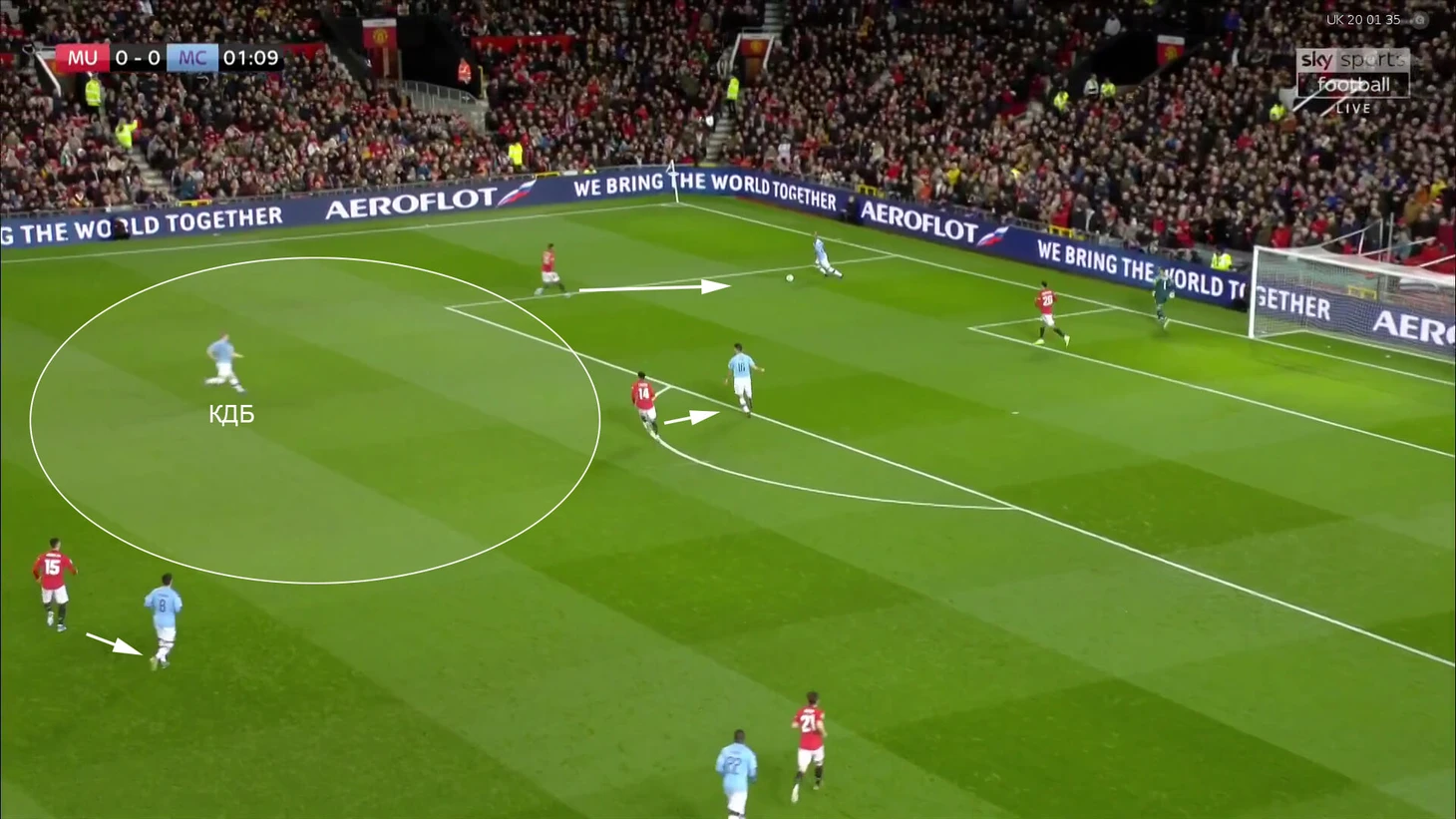 Португалец оттягивался поглубже для помощи под давлением, а центральные защитники «МЮ» не следовали за ним так глубоко. В этом моменте Силва вне кадра, но уже влияет на эпизод – КДБ свободен, а Фред разрывается между ним и Бернарду. Фред накроет КДБ, но с опозданием: