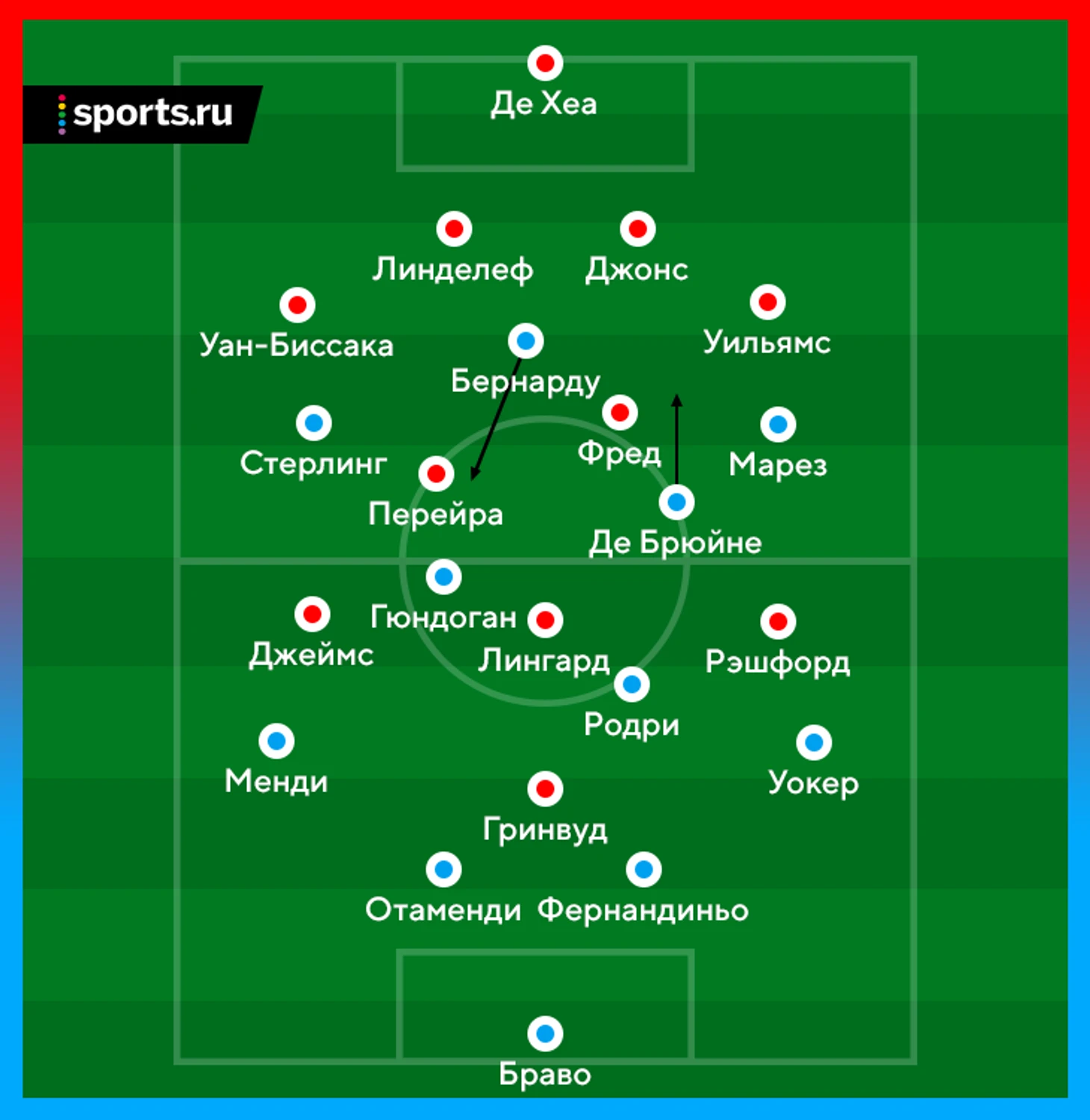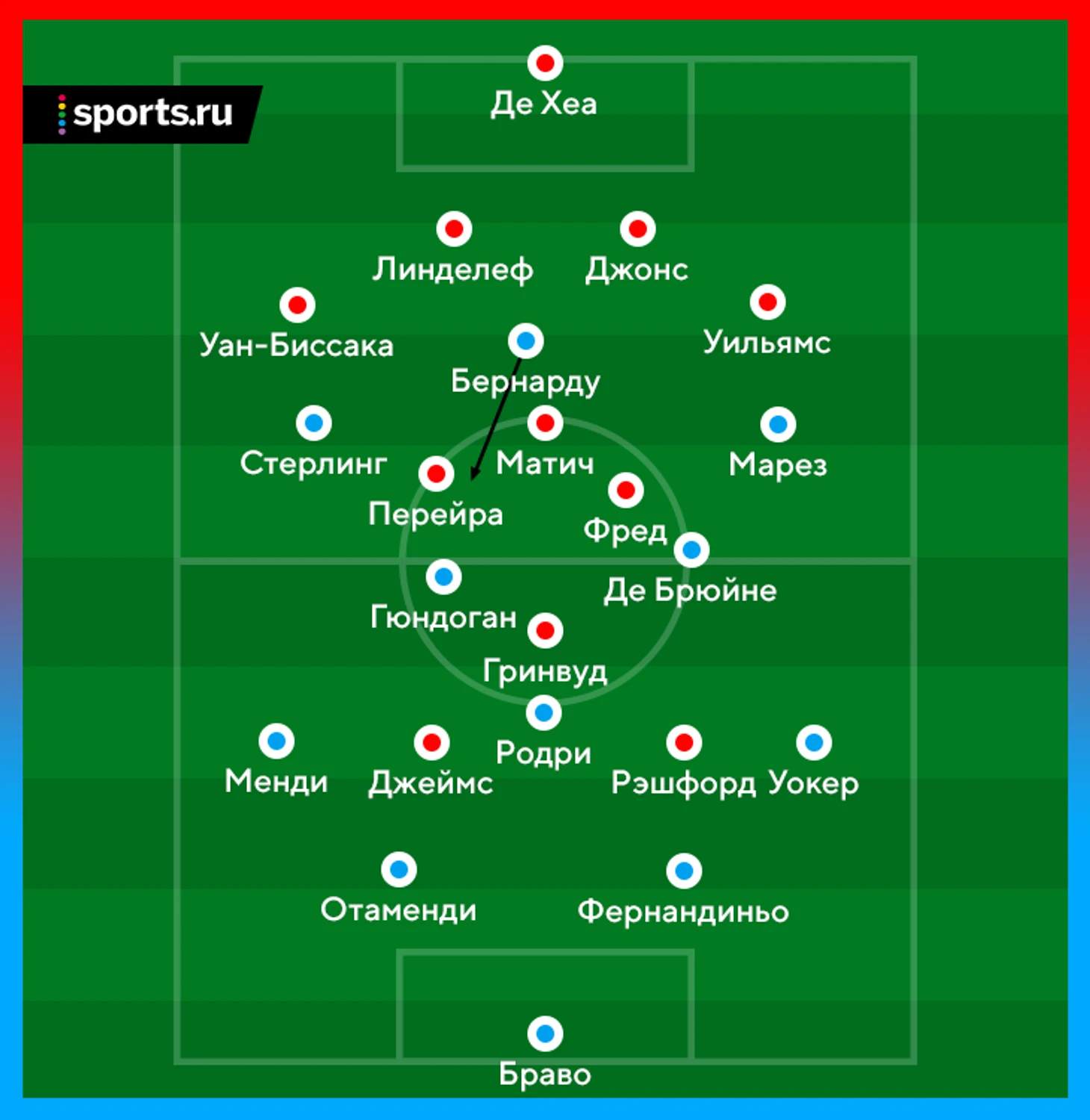 В первом работа Гвардиолы над ошибками предыдущего дерби создала «Сити» платформу для доминирования. Пеп предложил новые ходы и в розыгрыше мяча, и в прессинге, и позиционных атаках. Ключевой фигурой был как раз Бернарду в роли ложной девятки.