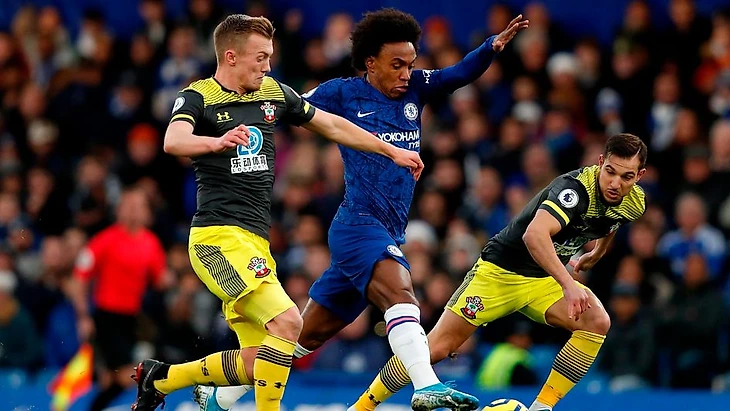 При этом компактная полузащита, к которой присоединялся Редмонд при прохождении первой волны прессинга, не позволяла игрокам «Челси» оказаться в большинстве в центре поля даже при смещении туда инсайдов. В результате ошибки Эмерсона и Хадсона-Одои Обафеми открыл счет. Лэмпард попытался исправить положение на поле, перейдя с 3-4-3 на 4-2-3-1, но это только усложнило задачу «Челси», так как узкое расположение вингеров обеспечило «святым» преимущество 4v3 в центре (у Редмонда больше не было необходимости помогать двум форвардам), а Канте с Жоржиньо накрывать стало еще проще.