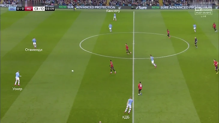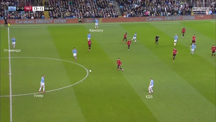 Канселу, Отаменди, Уокер составляли гибридную тройку защитников. Иногда они располагались по всей ширине поля как типичная тройка. Иногда Канселу был левым защитником, а Отаменди с Уокером закрывали центр. Справа не играл никто. Лишь когда этого совсем явно требовала ситуация, туда опускался Кевин Де Брюйне.