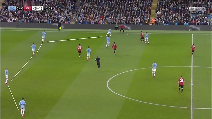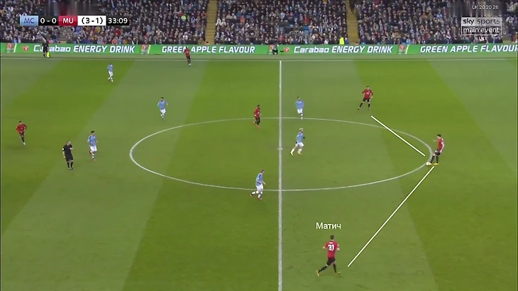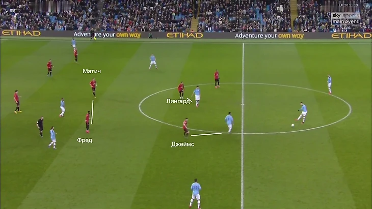 С начала второго тайма «МЮ» добавил к этому и преобразования в оборонительной структуре – вместо Мэйсона Гринвуда вышел Дэн Джеймс. Теперь у «МЮ» не было строгого деления на тройку центра поля и пару нападающих – теперь был Марсьяль в роли форварда, пара опорников Фред-Матич и Лингард с Джеймсом, играющие по опорникам соперника (Гюндоган и Родри).