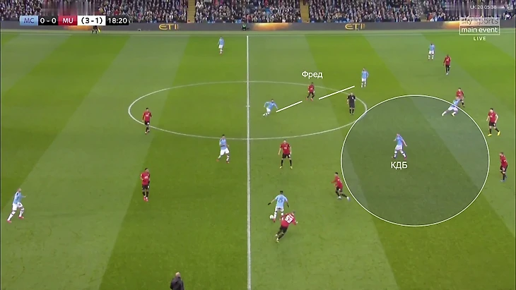 Фред разрывается между двумя соперниками, плюс КДБ полностью свободен – при правильном розыгрыше у «Сити» будет сразу два свободных игрока в чужой опорной: