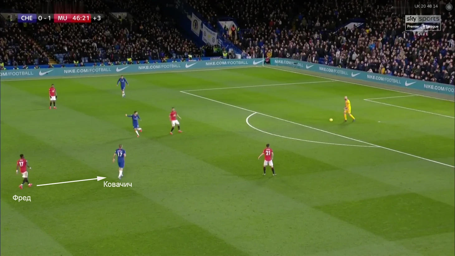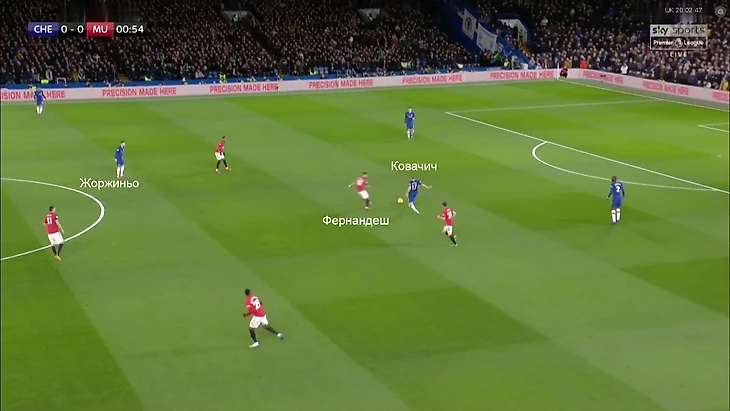 Через пару мгновений Ковачич уже отвлекает Фернандеша от Жоржиньо. Опорника «Челси» спешно пытается прикрыть Антони Марсьяль, но свободный игрок все равно появился (Кристенсен, которого оставил Марсьяль):