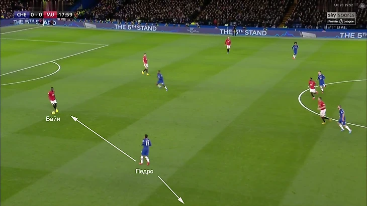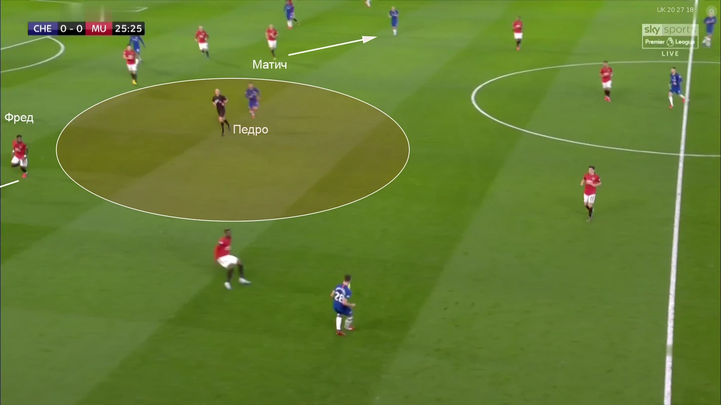 Но в лучшей атаке первого тайма «Челси» здорово показал, как можно вскрывать систему опеки Сульшера. Все начинается с синхронных рывков на фланги Маунта и Ковачича – опорники «МЮ» играют персонально, открывается огромная зона в центре, куда опускается Педро: