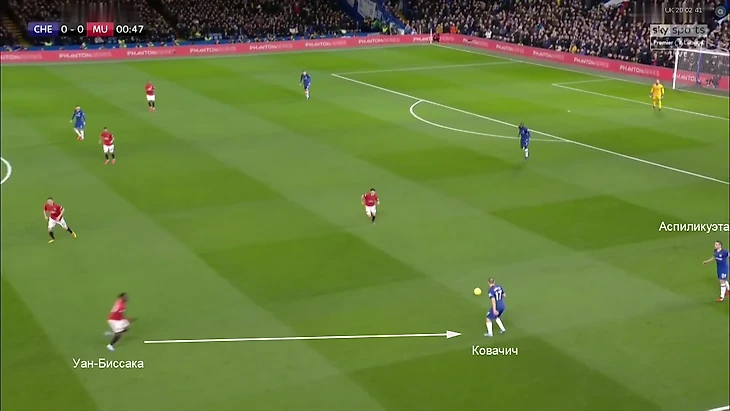 Он разбивал ее и за счет техники, и за счет передач, и за счет движения. Часто Ковачич оказывался в неудобных для соперника зонах, что сбивало «МЮ» систему опеки. Тут Матео в фирменном стиле опустился поближе к левому флангу. Матич за ним так далеко не идет, Уан-Биссака вынужден перестраиваться, свободным игроком оказывается Аспиликуэта: