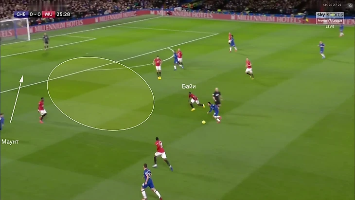Байи выдвигается на испанца, но с опозданием – плюс он оставляет пространство в защите для паса вразрез. Именно в эту зону врывается Маунт, который изначально увел Фреда.