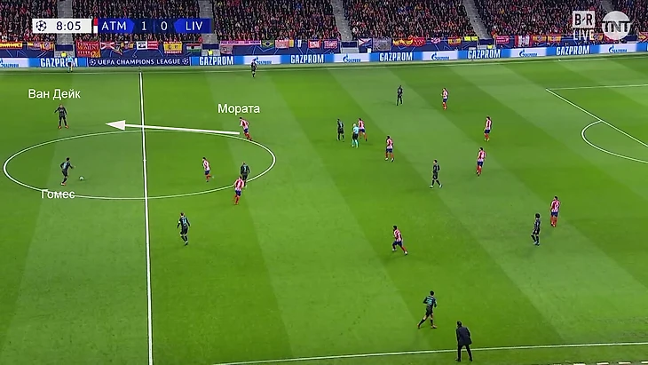 Мяч у Гомеса. Нет активного давления, но Мората уже читает возможный пас на Ван Дейка, которого сразу же накроют: