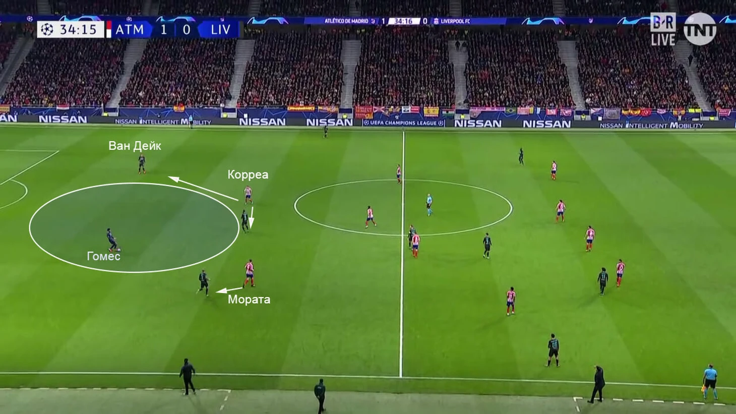 Иногда Гомесу оставляли демонстративно много свободы, перекрывая других футболистов. Здесь Корреа читает пас на ван Дейка (и при необходимости на Вейналдума), а Мората – на опустившегося поглубже Фабиньо: