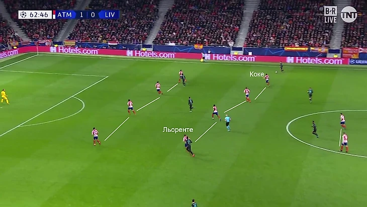 Первый – выбор базовой стратегии. Глубокая защита, схема 4-4-2, компактность, закрытый центр. «Атлетико» всегда так играет. Перед матчем Сауль даже подтвердил, что именно это готовится под англичан: «Ливерпуль» – максимально гибкая команда. Они великолепны во всех аспектах, но если выбирать сценарий, который для них труднее, чем остальные, то это игра против глубоких оборон».