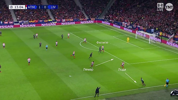 8. Справа «Ливерпуль» атакует иначе. Салах не стягивается к Тренту, а наоборот оставляет его свободным для игры 1-в-1 и навесов. Мо почти всегда играет дополнительного нападающего при владении. Поэтому здесь у «Атлетико» тройка строилась иначе – Фелипе, Лоди и Лемар. Ключевым аспектом вновь была своевременная передача игроков.