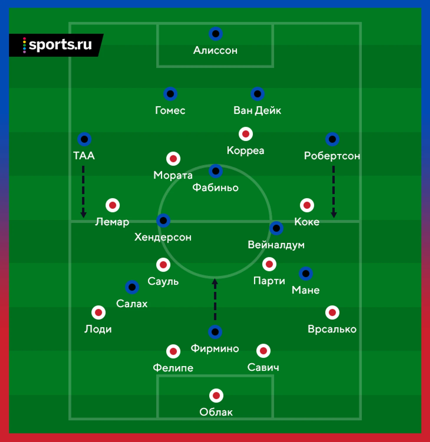 3. Матч оказался достаточно статичным в тактическом плане. Обычно для удобства мы делим встречу на несколько стадий, но в данном случае все 90 минут была схожая картина, которую не изменили даже смелые замены тренеров (Клопп заменил Салаха и Мане, Симеоне выпустил Льоренте на фланг).