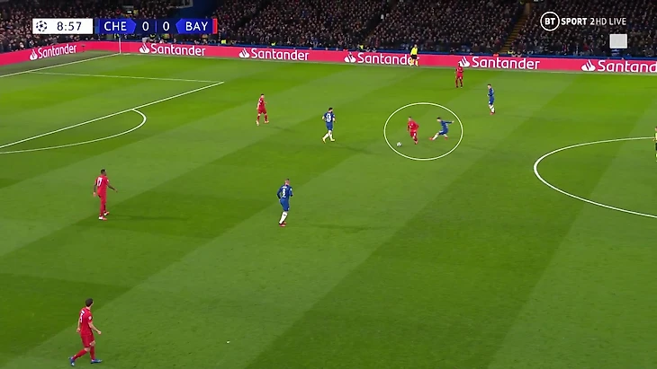 5. Был еще один тип эпизодов. «Челси» сохраняет высокие позиции для прессинга (в частности – высокую защиту), но на Тиаго не выдвигается вообще никто. Это было еще опаснее, потому что в таком раскладе Алькантара мог напрямую создавать моменты. Здесь он вывел на опасный удар Левандовского: