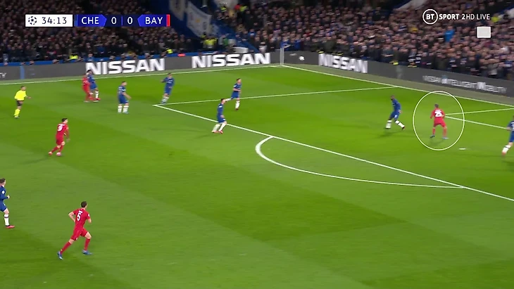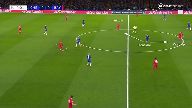 Жоржиньо не успевает накрыть Тиаго. У него сразу несколько вариантов для продолжения, а в опорной Матео Ковачич разрывается между Гнабри и Мюллером.