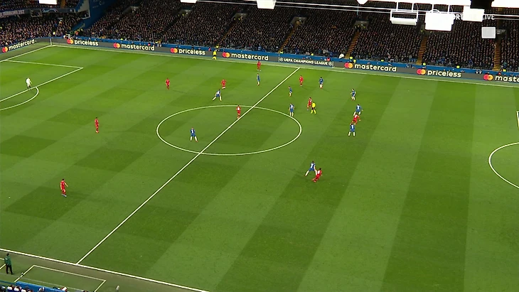 На повторе хорошо видно, как высоко располагается линия и как развернуты защитники «Челси». Это позиция для прессинга, но партнеры выше не оказывают давления на футболиста с мячом: