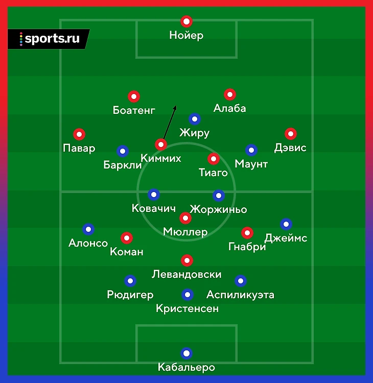 Состав «Челси» лишь помогал «Баварии» в этом. Критически не хватало открываний за спину защитникам от быстрых игроков. Лэмпард был сильно ограничен в выборе, но вышедшие в старте Жиру и Баркли плохо подходили под такой рисунок.
