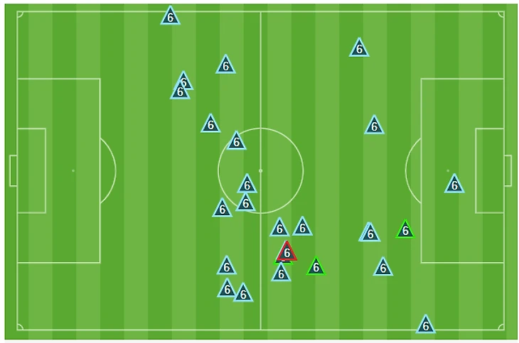 11. Тиаго Алькантара прекрасен. Он проделал огромнейший объем работы в контрпрессинге. Вот карта его оборонительных действий: большая часть – подборы на чужой половине поля. Испанец идеально читает такие эпизоды: