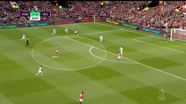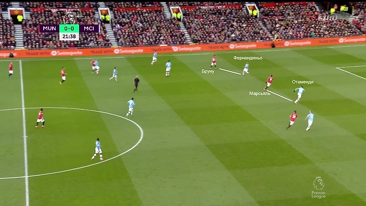 Против Бруну очень тяжело играть, потому что он сочетает несколько классных качеств. Фернандеш не просто созидатель, который требует мяч в ноги, но и умный интерпретатор эпизодов. При необходимости он делает альтруистичные рывки, чтобы освободить партнеров. Здесь Марсьяль оказался против Отаменди именно из-за своевременного движения Бруну: