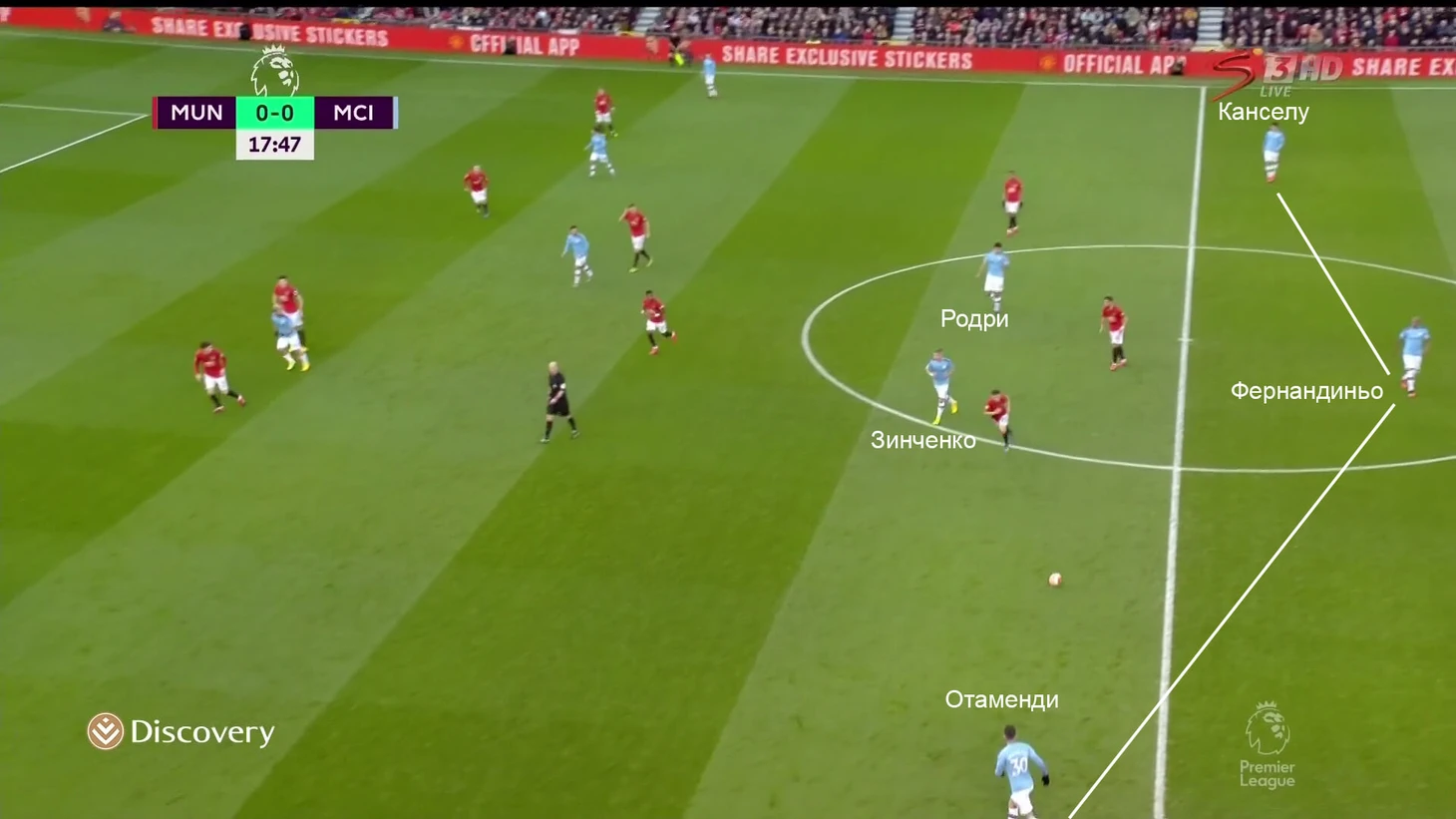 Первый вариант против персонального давления «Юнайтед» – смена позиций Зинченко и Гюндогана. Украинец шел в опорную зону, а немец становился ситуативным левым защитником: